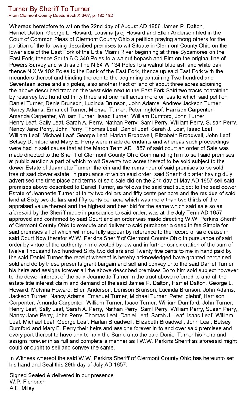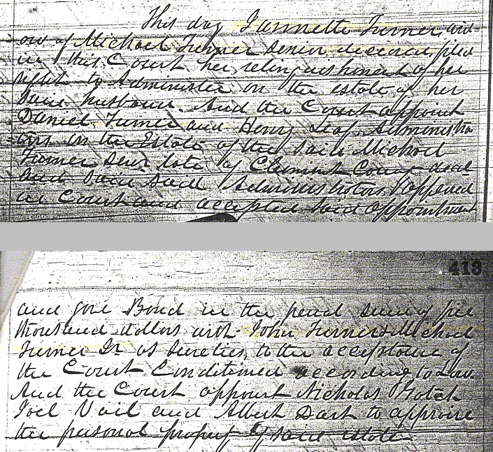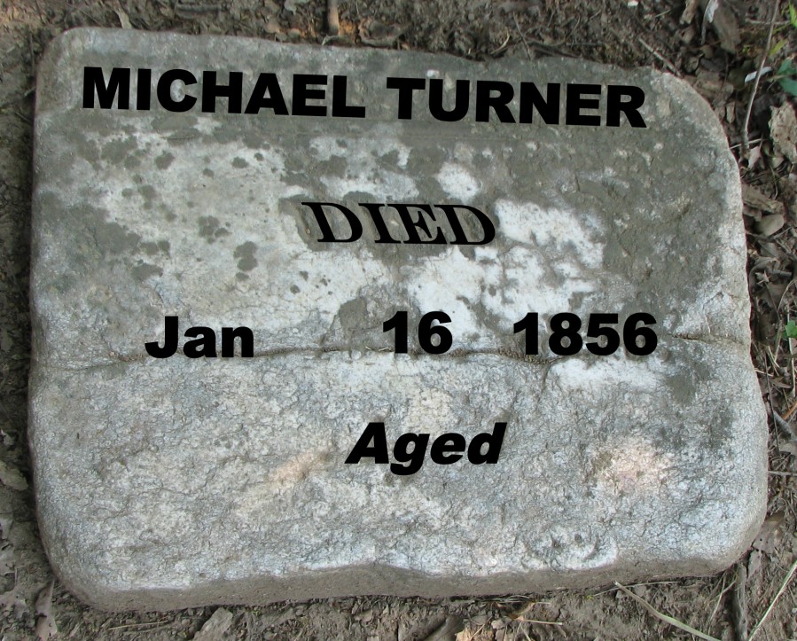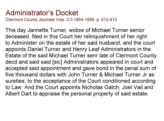 On Jan. 23, 1856, Michael Turner's widow Jannette (Brent) Turner made a court filing to relinquish the right to administer the estate of her late husband and that task was turned over to Daniel Turner and Henry Leaf. Also, a deed was recorded on July 29, 1857 which partitioned Michael Turner's property amongst his heirs.