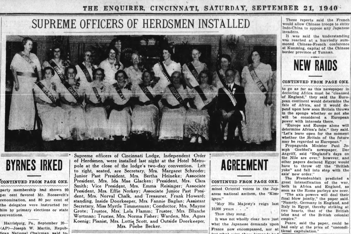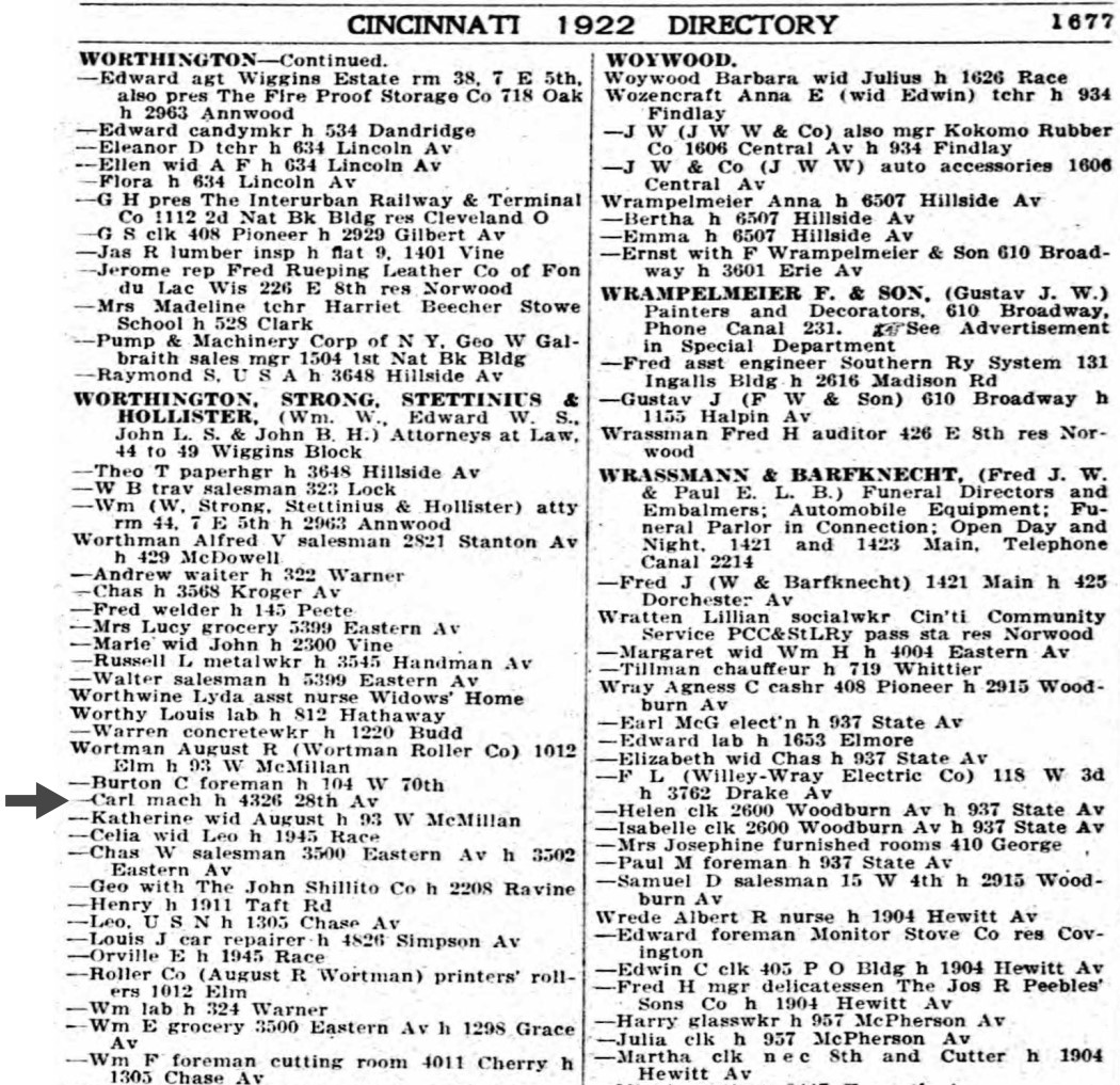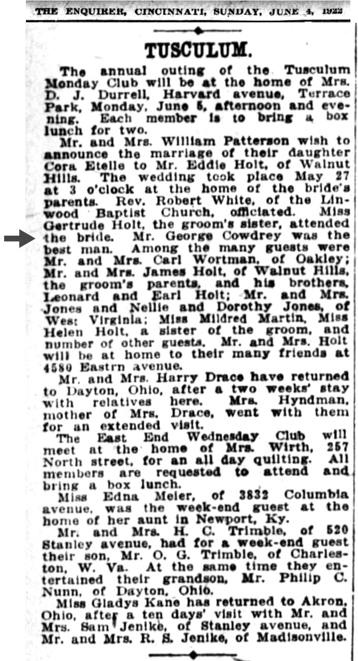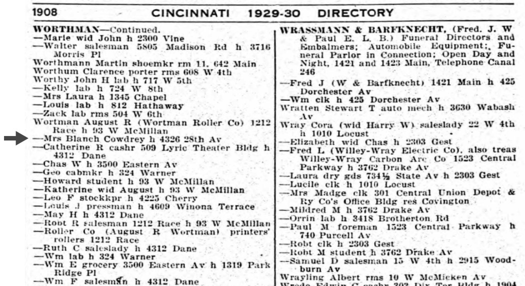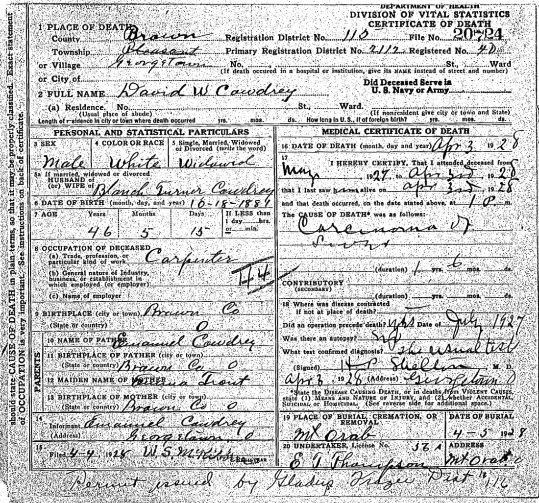 Zetta Blanche Turner, the youngest child of George Washington and Martha Melissa (Forbes) Turner, was born when Martha was 38 years old. Here's a picture of Blanche around age 9. She married three times with her first two marriages ending in divorce. Even her third marriage seems to have been rocky at times based on a few civil suits filed between the husband and wife. Blanche's application for her second marriage license in 1915 indicated that her first marriage ended in divorce in 1911 after eight years of marriage. Curtis N. Gilbert, her second husband, was also previously divorced; in the 1920 census he was listed as a divorced lodger in the Los Angeles home of Jasper von Bulow. According to the 1920 census, Blanche indicated her last name was Cowdrey and that she was divorced. She likely went back to using the Cowdrey name because her two sons by David Cowdrey were living with her. So, Blanche's second marriage must have ended before 1920. Although we have not found a marriage document for her third marriage to Carl Wortman, we suspect it took place around 1921. The 1922 Cincinnati Directory shows Carl Wortman, George Cowdrey (Blanche's oldest son) and Martha M. Turner living at Carl Wortman's home at 4326 28th Ave. in Oakley. We assume that Blanche and her youngest son, Bramble, were living there as well and that she had likely married Carl Wortman by that time. We also found a Cincinnati Enquirer article dated June 4, 1922 indicating that Mr. and Mrs. Carl Wortman attended a wedding at which Blanche's son, George Cowdrey, was the best man. Blanche seems to have continued using the last name Cowdrey for many years after her third marriage (see this 1929 Cincinnati Directory listing). She was a tailoress and belonged to several organizations and it was likely easier for her to continue using her Cowdrey last name for professional reasons. Blanche's first husband, David W. Cowdrey, died on April 3, 1928 in Georgetown, Brown Co., Ohio (see death certificate). His death certificate indicated he was widowed and that Blanch Turner Cowdrey had been his spouse. The informant was his father, Emanuel Cowdrey. We don't know if the informant misinterpreted that box on the death certificate; however, it is clear that Blanche was very much alive at the time of David Cowdrey's death. Perhaps David's 70 year old father, who passed away two years later, considered Blanche to be deceased; however, it's clear his children had a close relationship with their mother since they lived with her according to the 1920 census. The picture above from the Turner Family Reunion in 1925 clearly shows at least three Cowdreys in attendance in addition to Blanche and her third husband Carl Wortman. The two male Cowdreys were David's and Blanche's children and the third Cowdrey was the wife of her eldest son. Here's another picture taken on the front porch of the Wortman home in Oakley around the same time. In the years that followed, Blanche got involved in several clubs and organizations including the Independent Order of Herdsmen (perhaps related to her tailoress profession), where she served as president for a period of time, and the Daughters of America. Here's a picture of Blanche Wortman in 1940 when she was a Trustee with the Herdsmen (standing, fifth from left). Zetta Blanche (Turner) Wortman died in 1955. Here's a picture of her headstone in Mt. Moriah Cemetery near Withamsville, Clermont Co., Ohio. Carl F. Wortman died in 1965 and is also buried in Mr. Moriah Cemetery.