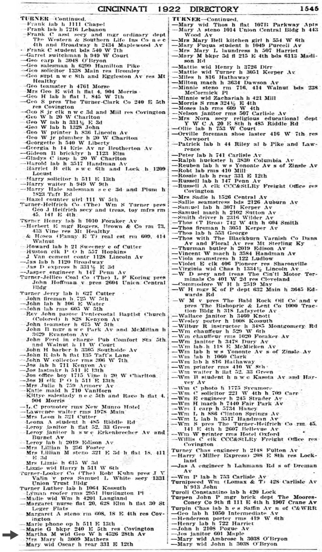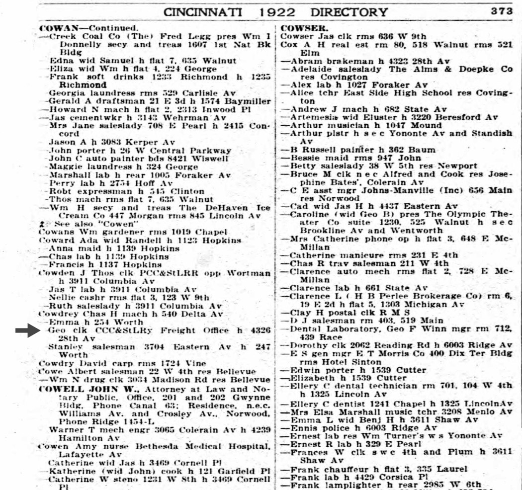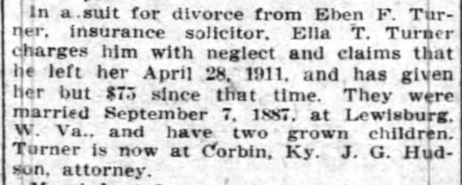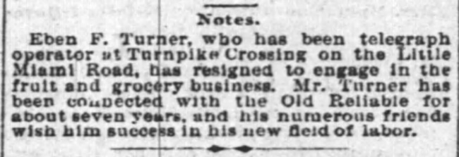 Eben Forbes Turner, who was born in Clermont Co., Ohio in 1865, seems to have started working for the railroad at the age of 14. According to a short piece in the Cincinnati Enquirer on April 26, 1886, he was a "telegraph operator at Turnpike Crossing on the Little Miami Road [Railroad]" and "has been connected with the Old Reliable for about seven years." According to the article, he was planning to embark on a career "in the fruit and grocery business." Eben Turner was the uncle who initially outlined the Turner family history to William Ellis Pruiett in 1924 (see Turner, Part 1). A short time after his career change, in September 1887, Eben Turner married Ella Thomas Worsham in Greenbrier Co., W.Va. where he was employed as a railroad agent according to the 1900 census. In 1898 Eben Turner's sister, Jeanette Brown, wife of Elmore Grant Brown, visited the couple at their home in West Virginia as indicated in this announcement in the Cincinnati Enquirer. By the 1910 census, Eben and Ella were living in Hamilton Co., Ohio where he worked as a fire and life insurance agent. He and Ella had two children, ages 20 and 21, but all must not have been well in their marriage because on April 9, 1912, an entry appeared in the Cincinnati Enquirer which indicated that Ella T. Turner had filed for divorce. A short time later, Eben Turner was back in West Virginia marrying his second wife, Genevieve Moore, on Feb. 23, 1915. According to the 1920 census, Eben (his first name was incorrectly written as Edwin) and Genevieve Turner were living near his mother on Setchell St. in the Columbia-Tusculum area of Cincinnati and Eben was back working for the railroad. He died on Nov. 12, 1931, at the age of 65, of chronic myocarditis and heart disease.
