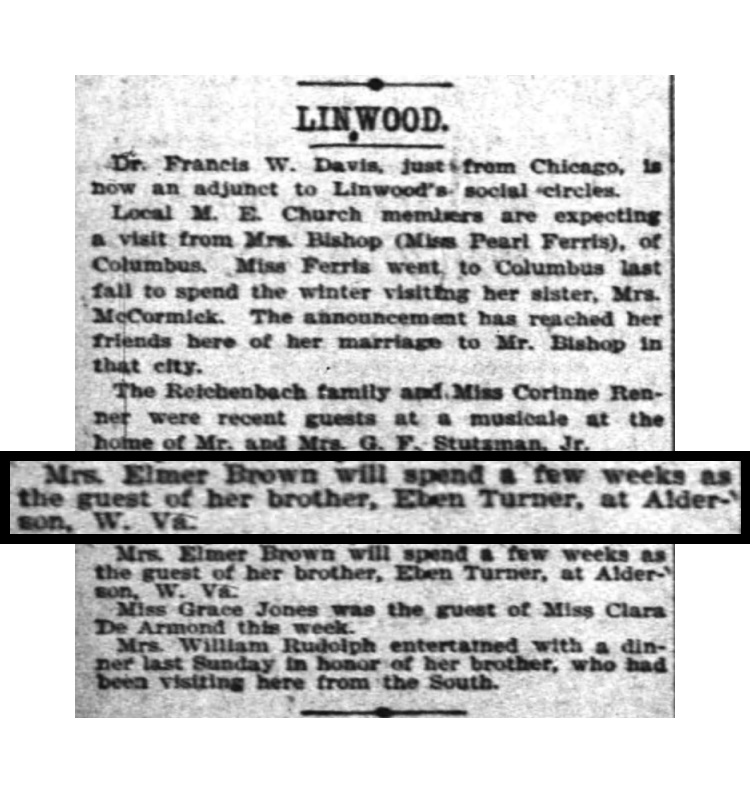 For more on Jeanette Turner, the daughter of George Washington and Martha Melissa (Forbes) Turner, after her marriage to Elmore Grant Brown of Newtown, Ohio, see Brown, Part 3.